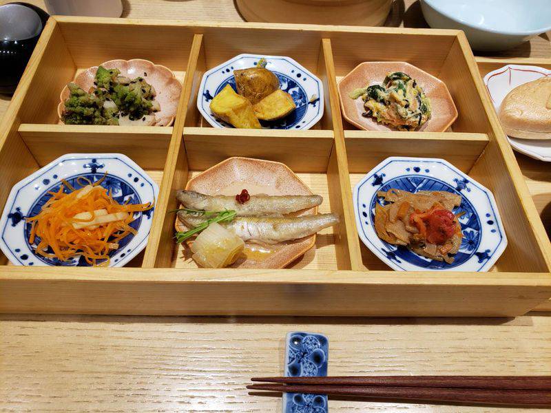 ご飯のお供の小鉢が6品と鯛のお刺身にごまだれ・・・・・・、