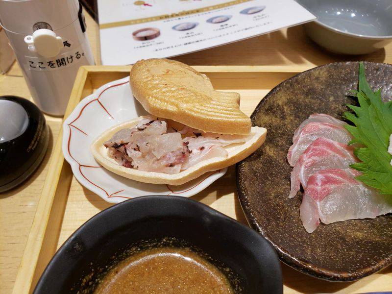 コチラは鯛の形をした最中の中に入った鯛の身の梅肉和えと薬味をご飯に乗せて、