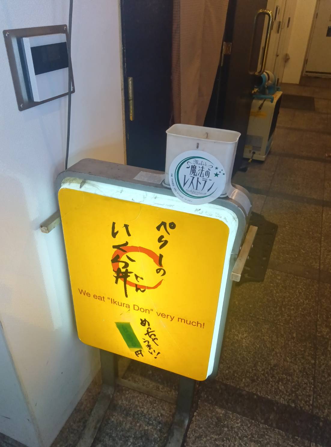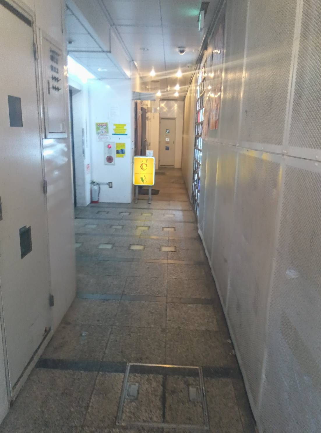 そのビルに入り1階の通路を奥へずずいっと進むと黄色い看板が一つポツリ、と見えてきます。
